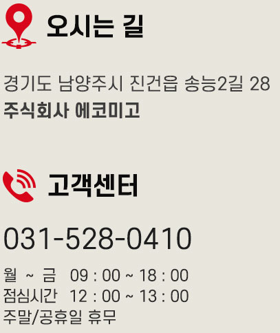 회사명 : (주)에코미고 │ 대표 : 박일천 │ 주소 : 경기도 남양주시 진건읍 송능2길 28 │ 사업자등록번호 : 132-86-19019고객센터 : 031-528-0410 │ 이메일 : eco4184@hanmail.net │ 개인정보책임관리자 : 경영지원본부COPYRIGHTⓒ ECOMIGO All rights reserved.